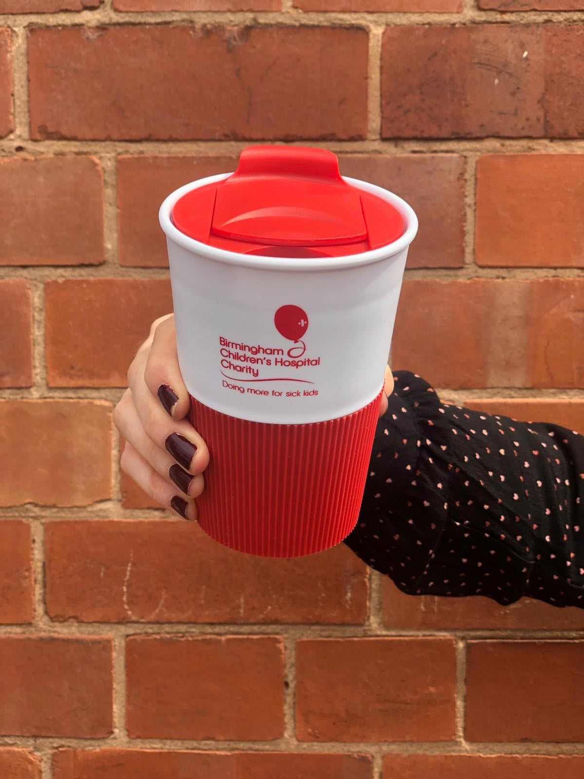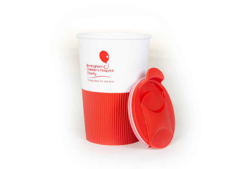 Our new take-away style mug in red and white, with Birmingham Children's Hospital branding, is a double-walled insulated mug made from PP (polypropylene) to keep drinks warm.
