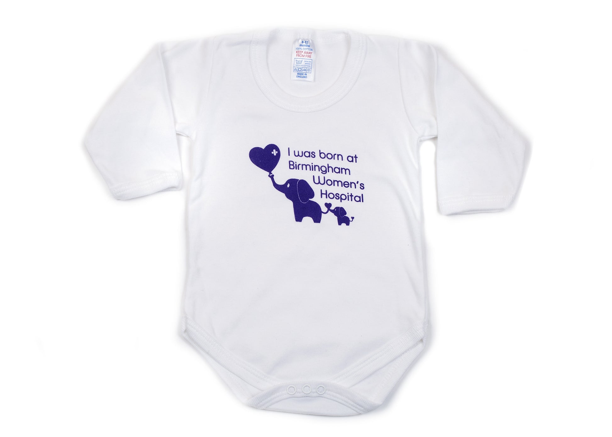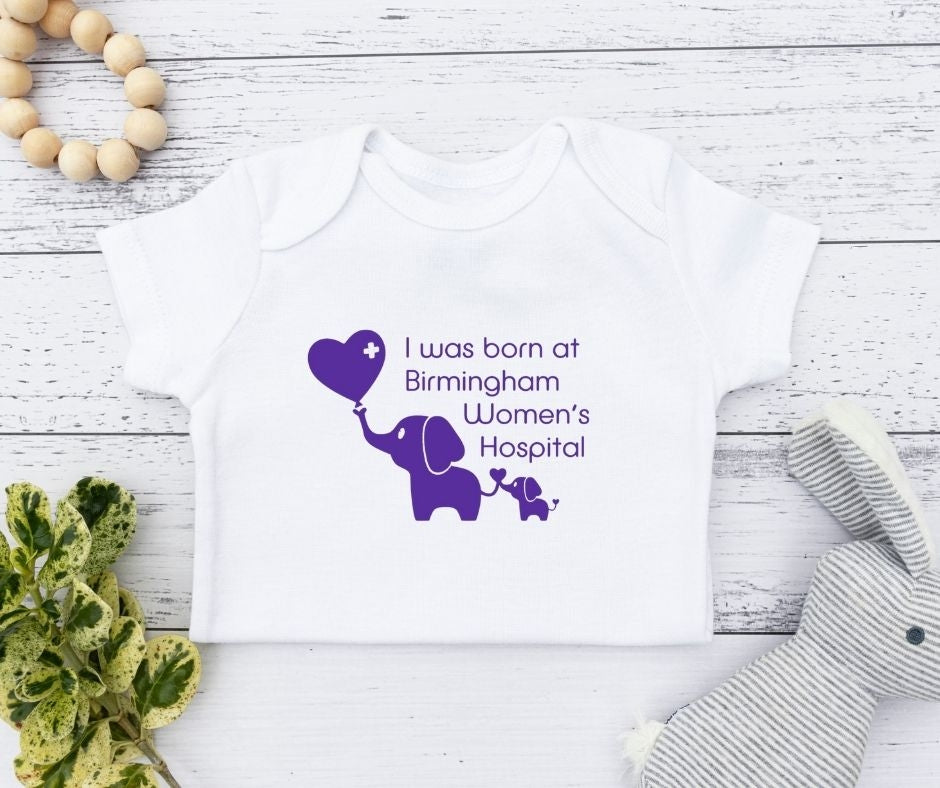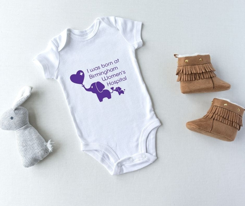 Lovingly crafted for all little ones born at Birmingham Women's Hospital. Welcome your new arrival in style with this super cute bodysuit featuring sweet lettering and adorable Parent and Baby Elephant designs.