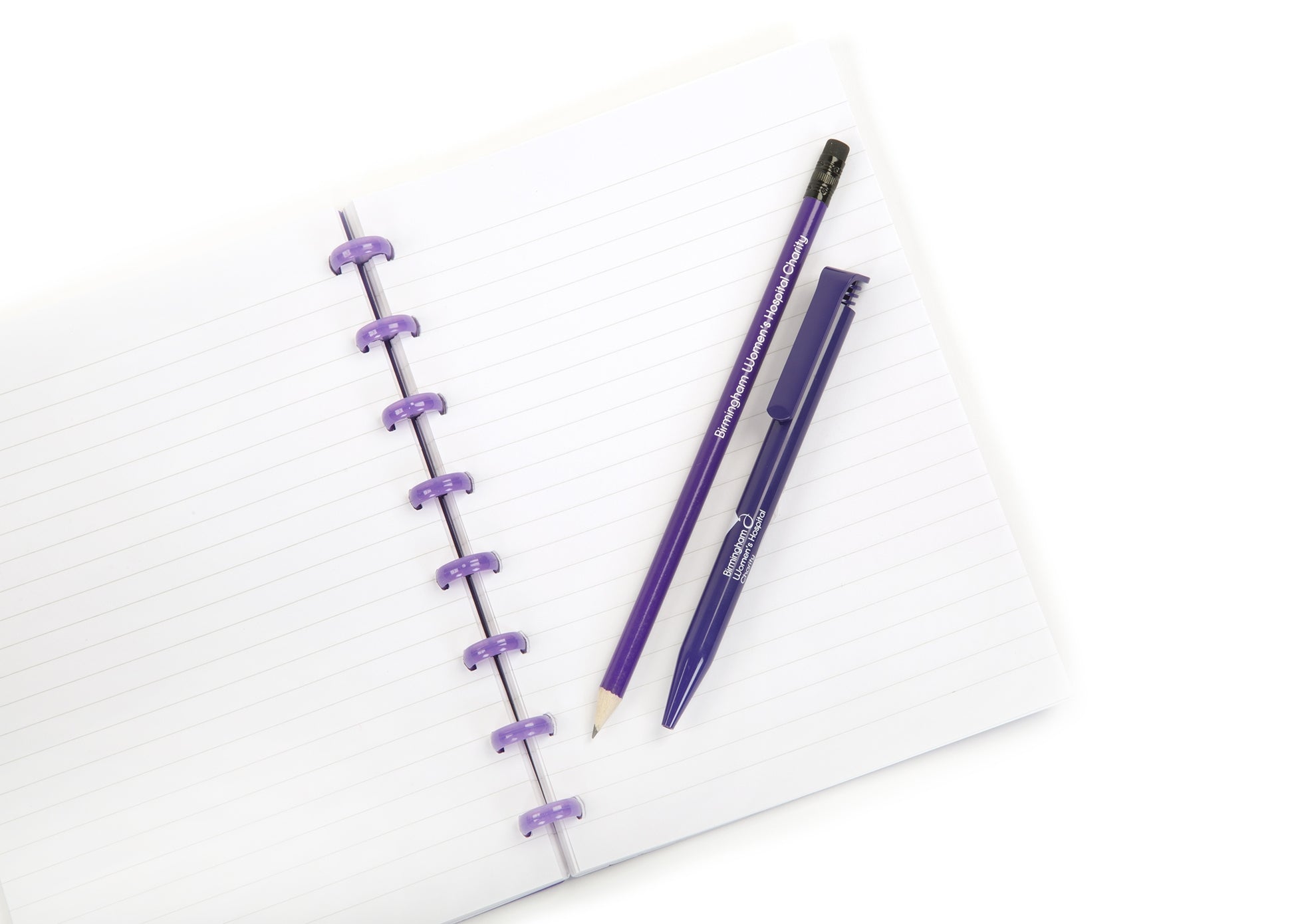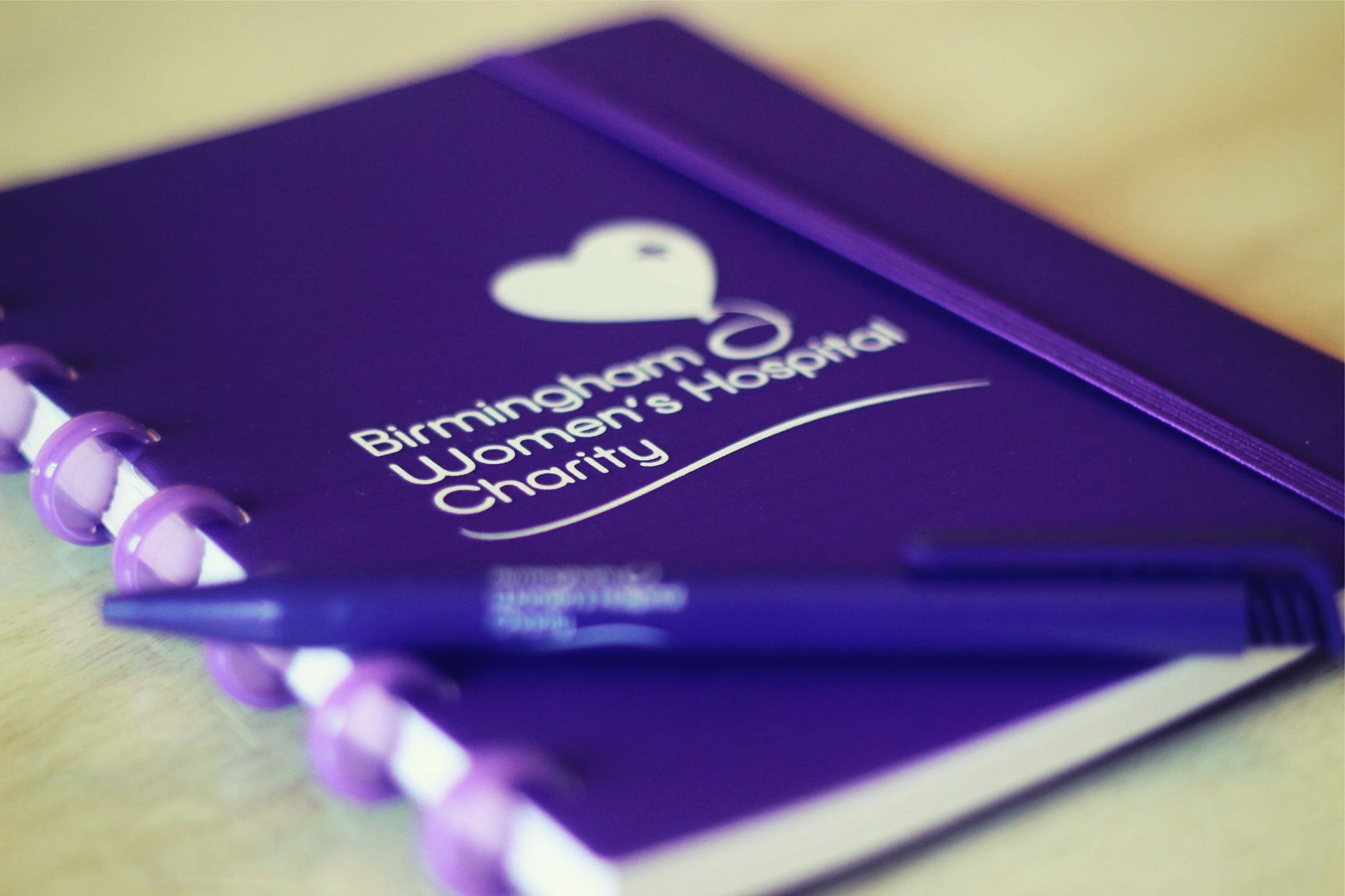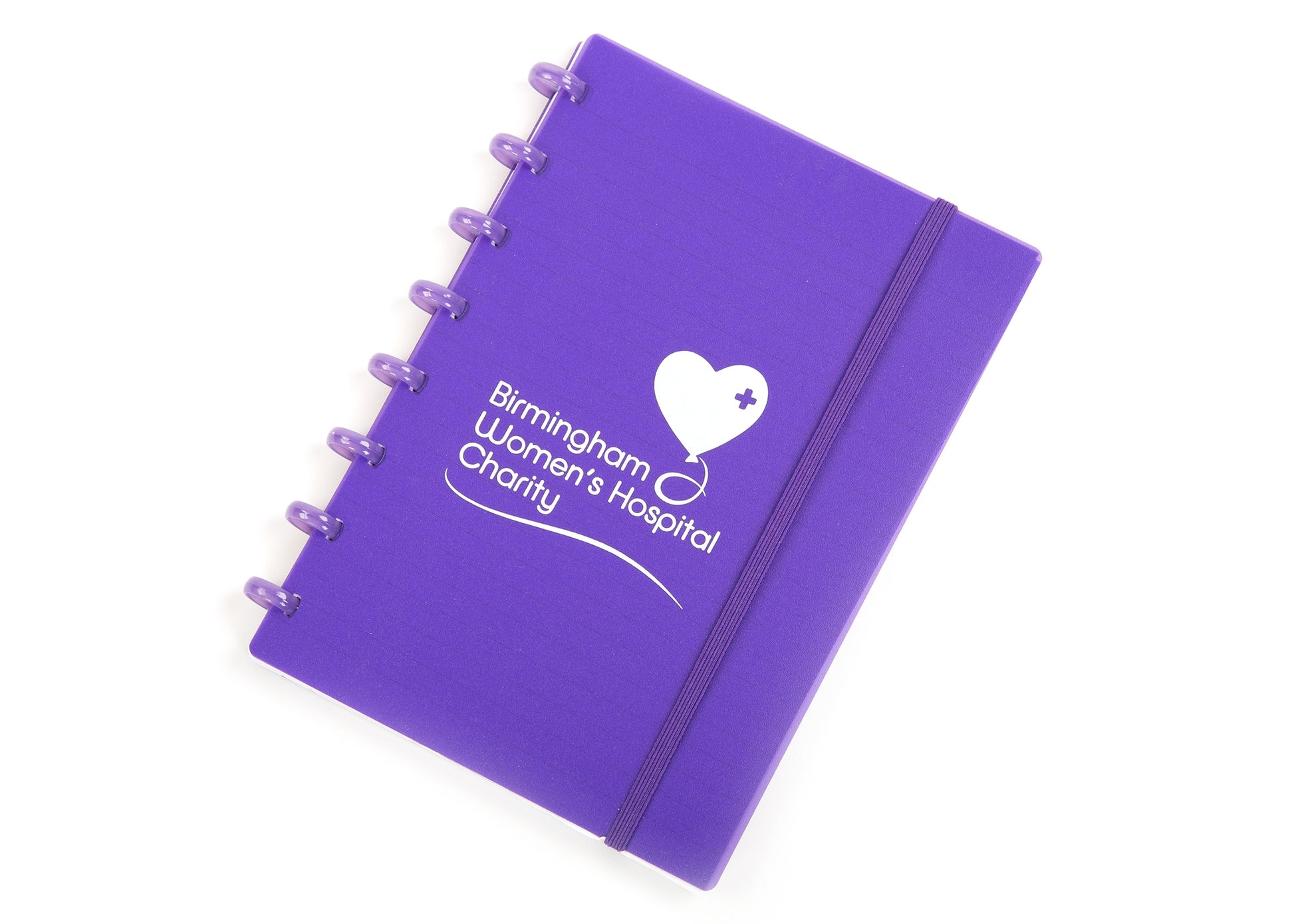 Birmingham Women's Hospital charity frosted notepad. Purple A5 notebook with a white Birmingham Women's Hospital Charity logo on the front cover. Bound with purple spirals with a purple elastic closure.