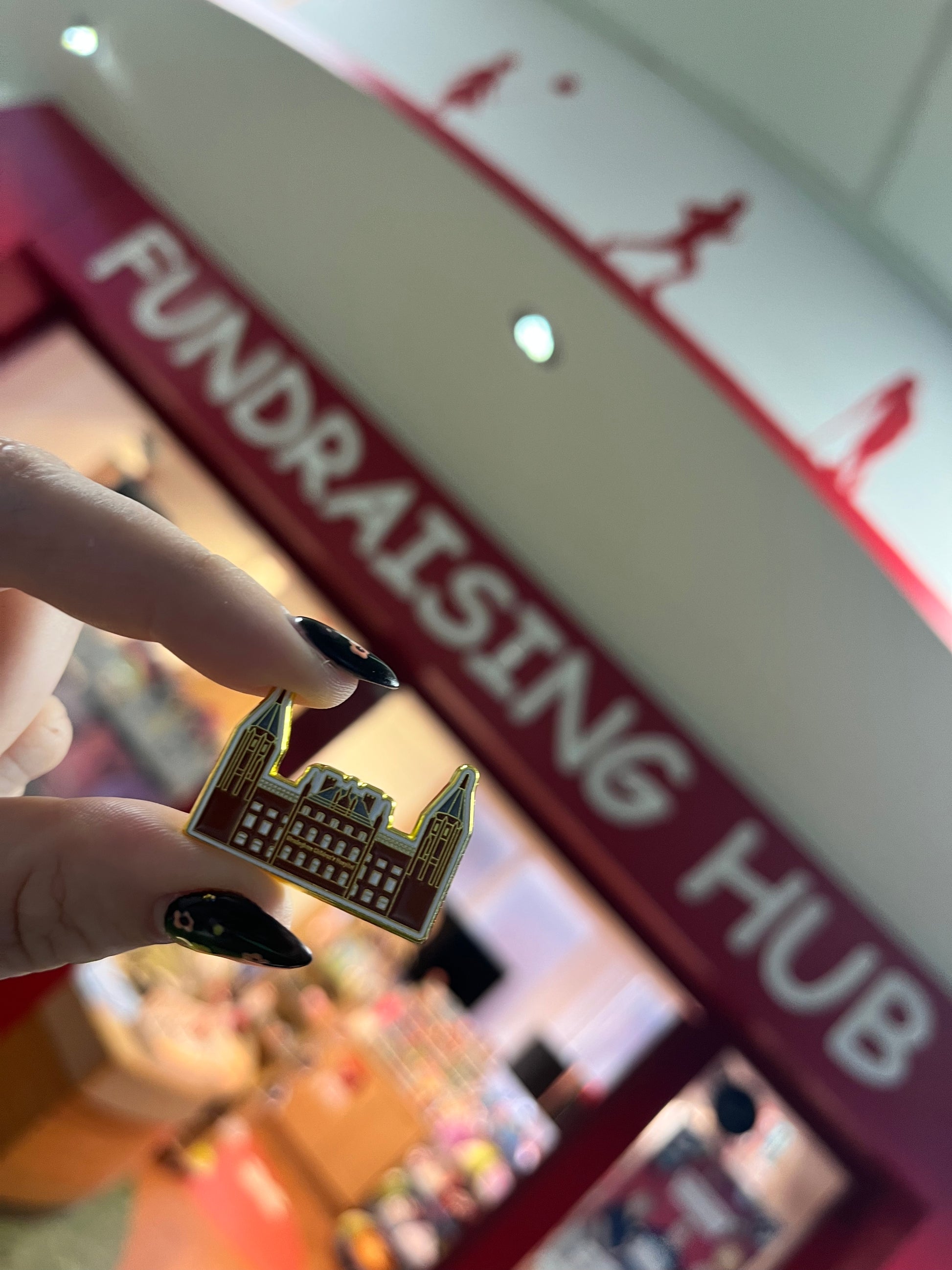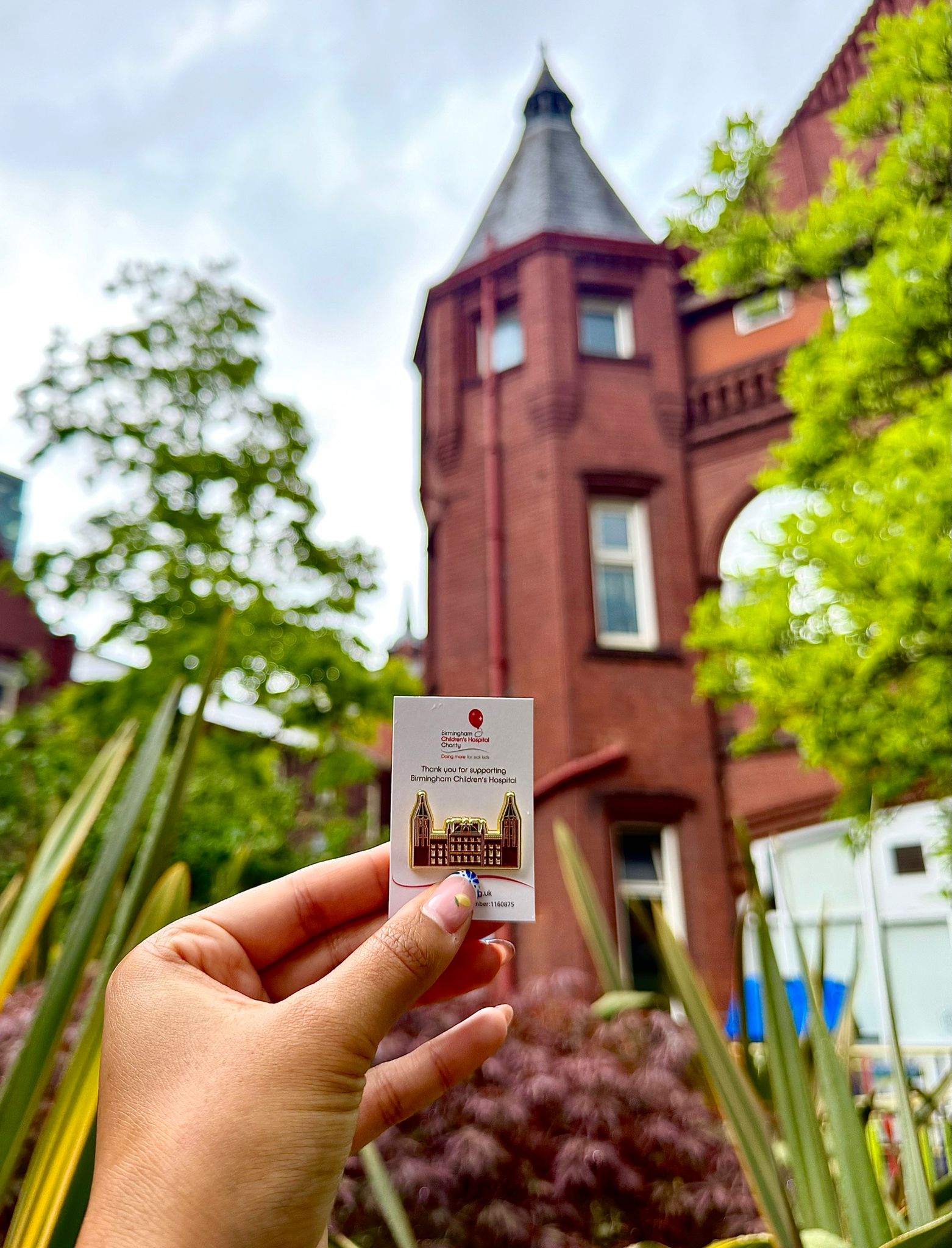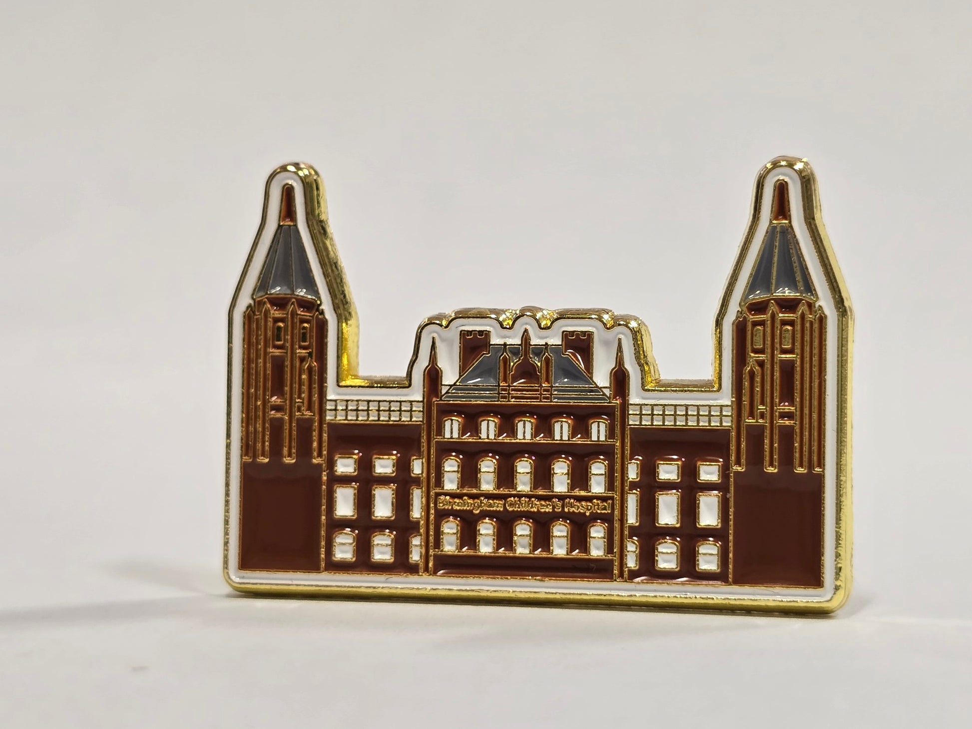 Enamel pin badge of the Birmingham Children's Hospital Building.